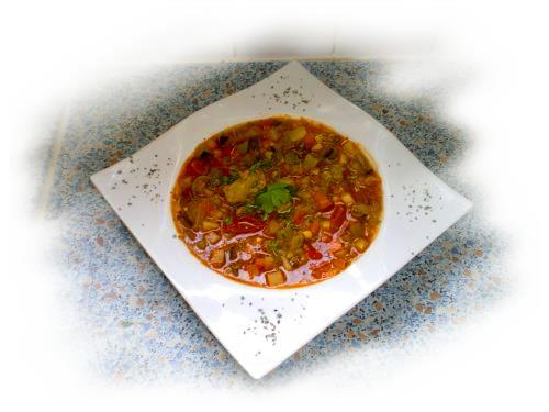 Das Gemüse in schöne gleichmässige Würfel schneiden (Karotten, Sellerie, Paprika [zu besseren Verdauung mit Sparschäler schälen], Kartoffeln, Zucchini, Melanzani würfeln, Tomaten kreuzweise einschneiden und im kochenden Wasser eine Minute einlegen, damit sie gut zu schälen sind, diese dann vierteln, entkernen und dann würfeln, Champignons halbieren und in Scheiben schneiden,Frühlingszwiebel & Lauch in Scheiben schneiden, Zwiebel & Knoblauch würfeln, Rote Linsen waschen, tiefgefrorenes so belassen)