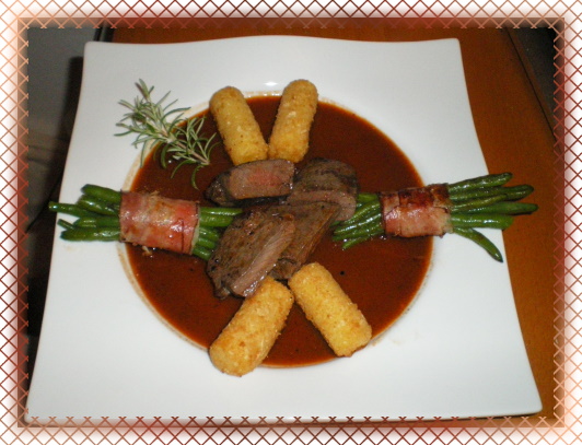 Rehrückenfilets in Schokolade-Rotwein- Sauce & Bohnen im Speckmantel sowie Kroketten