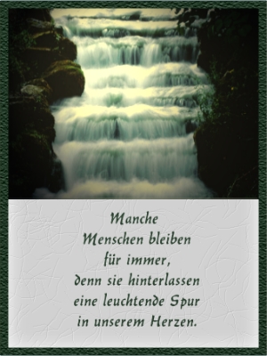 Du hast mit mir das Leben voller Kleinigkeiten geteilt und mein kleinstes Problem ernst genommen. Mir fehlen deine Ratschläge und ich erinnere mich gerne an die Zeit, die wir gemeinsam verbracht haben. Niemals hätte ich dir dies alles zurückgeben können, was du für mich getan hast. Das einzige, was mir nun noch von dir bleibt, ist meine Erinnerung an dich, die niemals verlöschen wird. Du warst für mich Oma, Mama und beste Freundin. Diesen Platz wirst du immer in meinem Herzen haben. Durch deine Liebe zu mir, die ich auch gegenwärtig verspüre, wirst du dort für immer weiterleben.